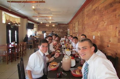 Today we had a zone activity and later went out to eat. One Elder, the zone leader, Elder B, took on their challenge. He had to eat a 7 layer hamburger with bacon and cheese, all in 20 minutes or less.